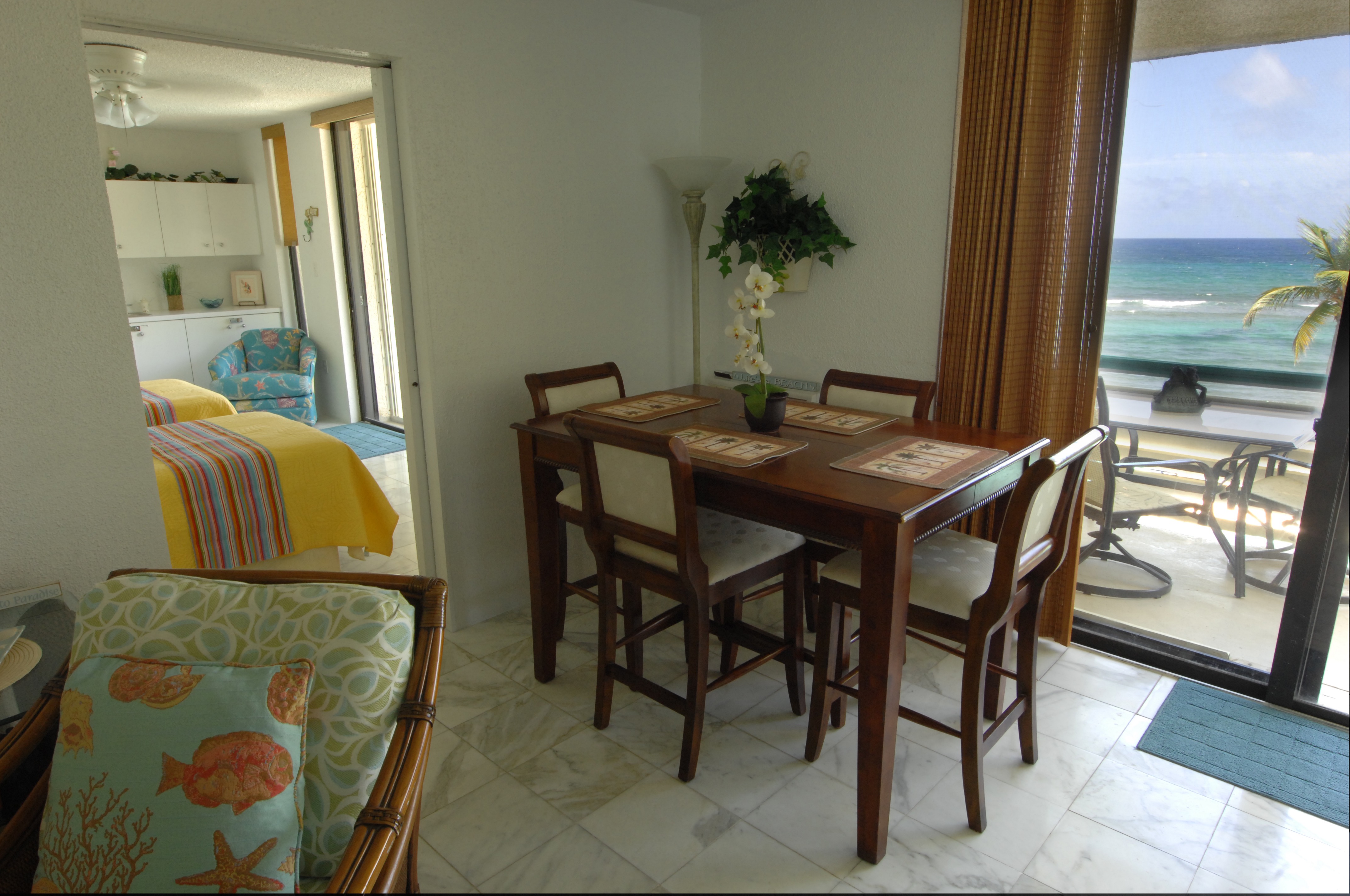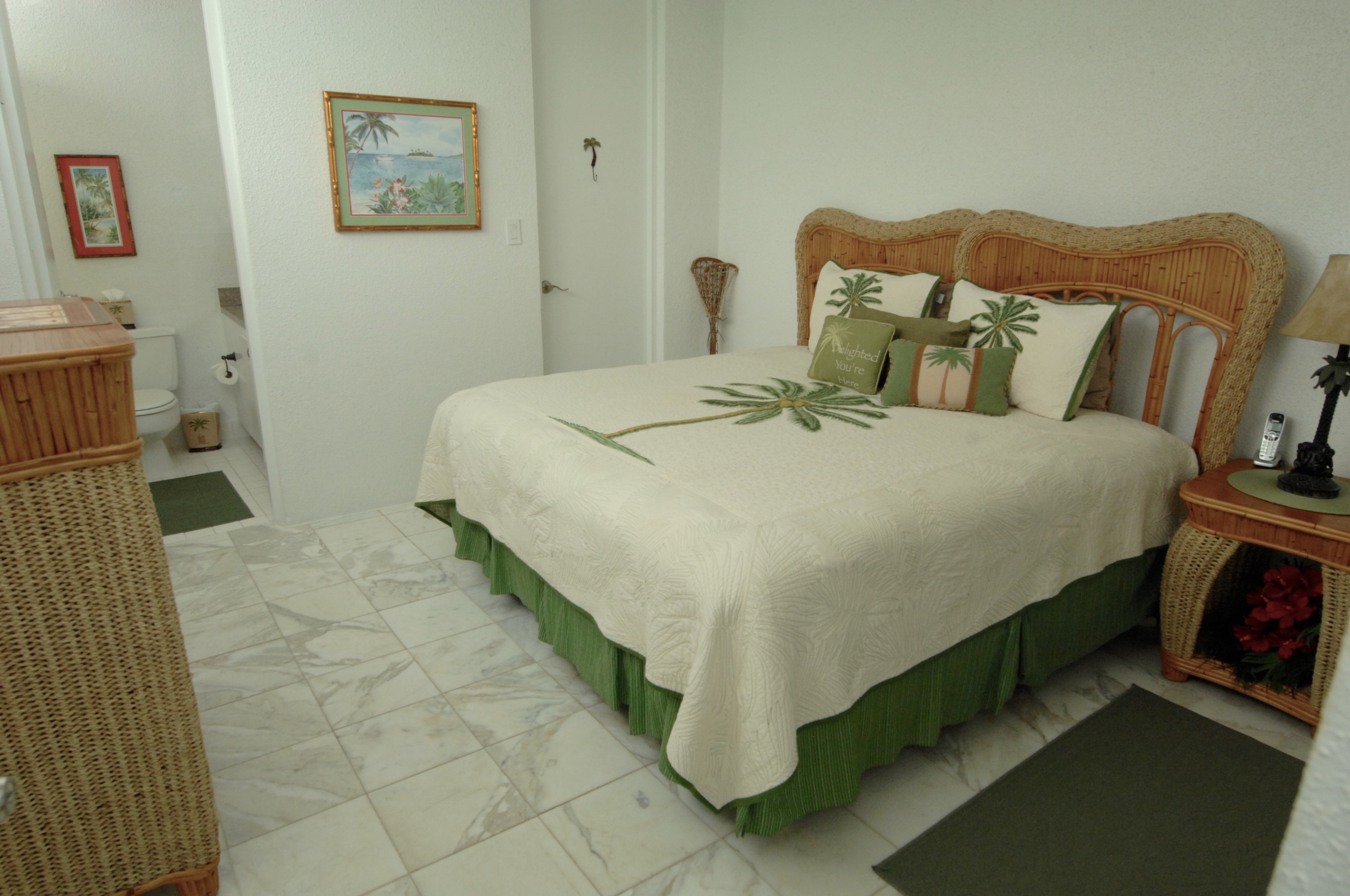 SPACIOUS CARIBBEAN LIVING!!! Master bedroom suite is the equivalent size of a Studio condo with King bed, dresser, futon/sofa, bistro table,en-suite full bathroom with tub and shower, A/C, ceiling fan, digital cable TV, walk-in closet & sliding door to 45' oceanfront furnished balcony,overlooking the tranquil pool